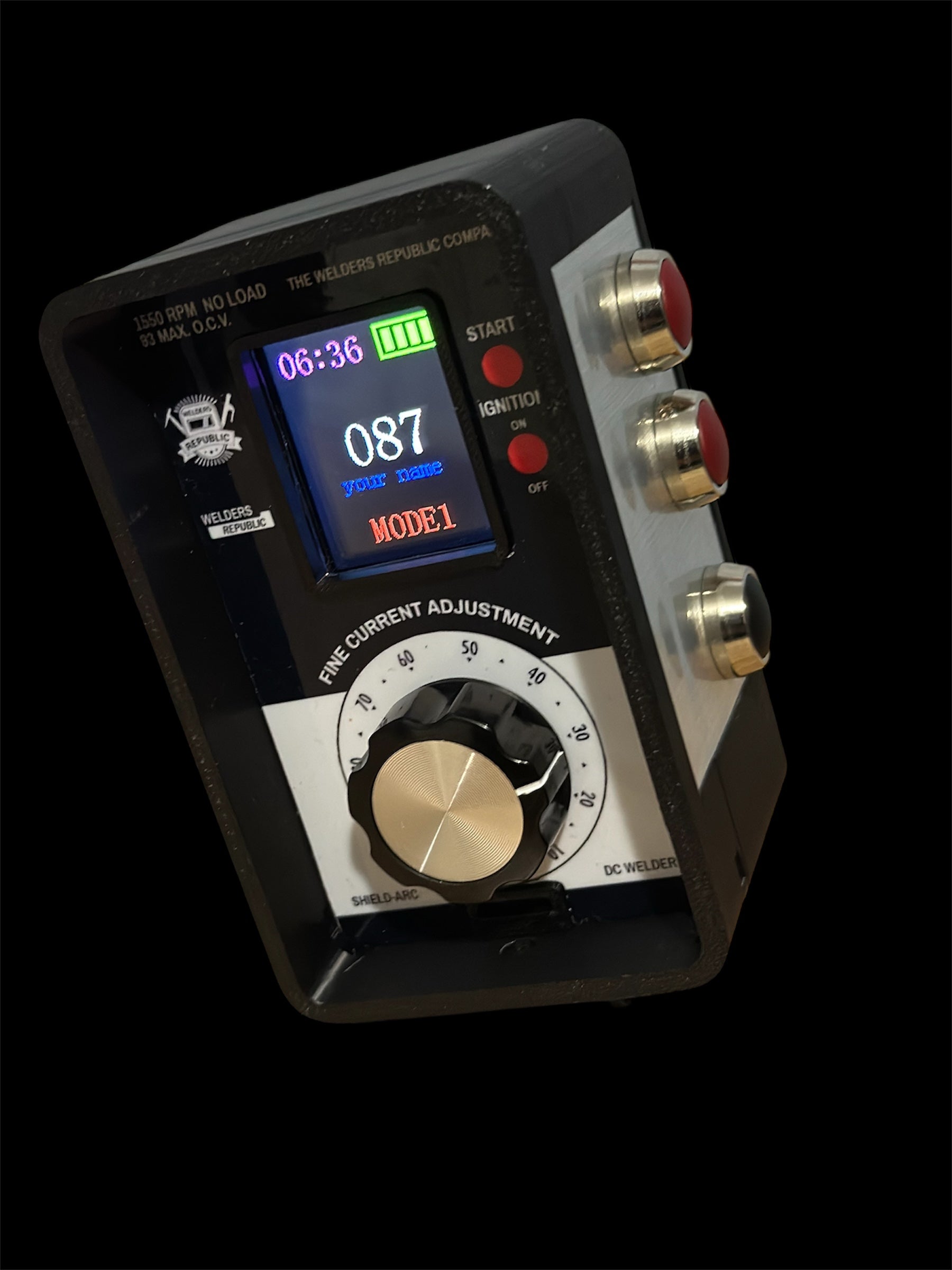 The screen displays the time, custom name, mode, battery level, and either amps or percentage.